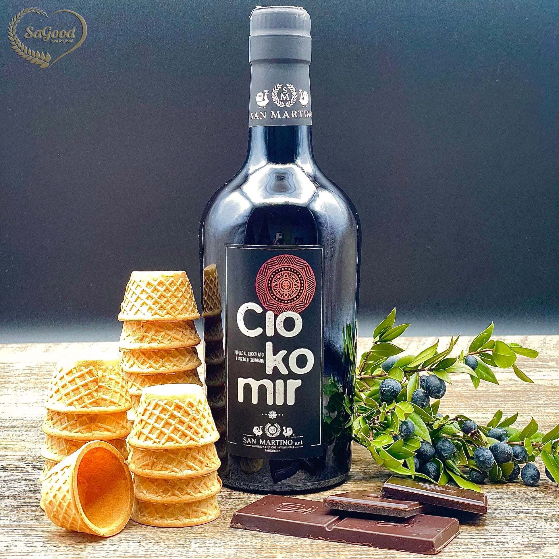 Liquore di Cioccolato e Mirto Rosso Selvatico, a bassa gradazione alcolica, da servire dentro la piccola cialda. Una delizia "mangia e bevi" per godersi un momento di puro piacere. Con la sua confezione diventa anche un ottimo regalo.
