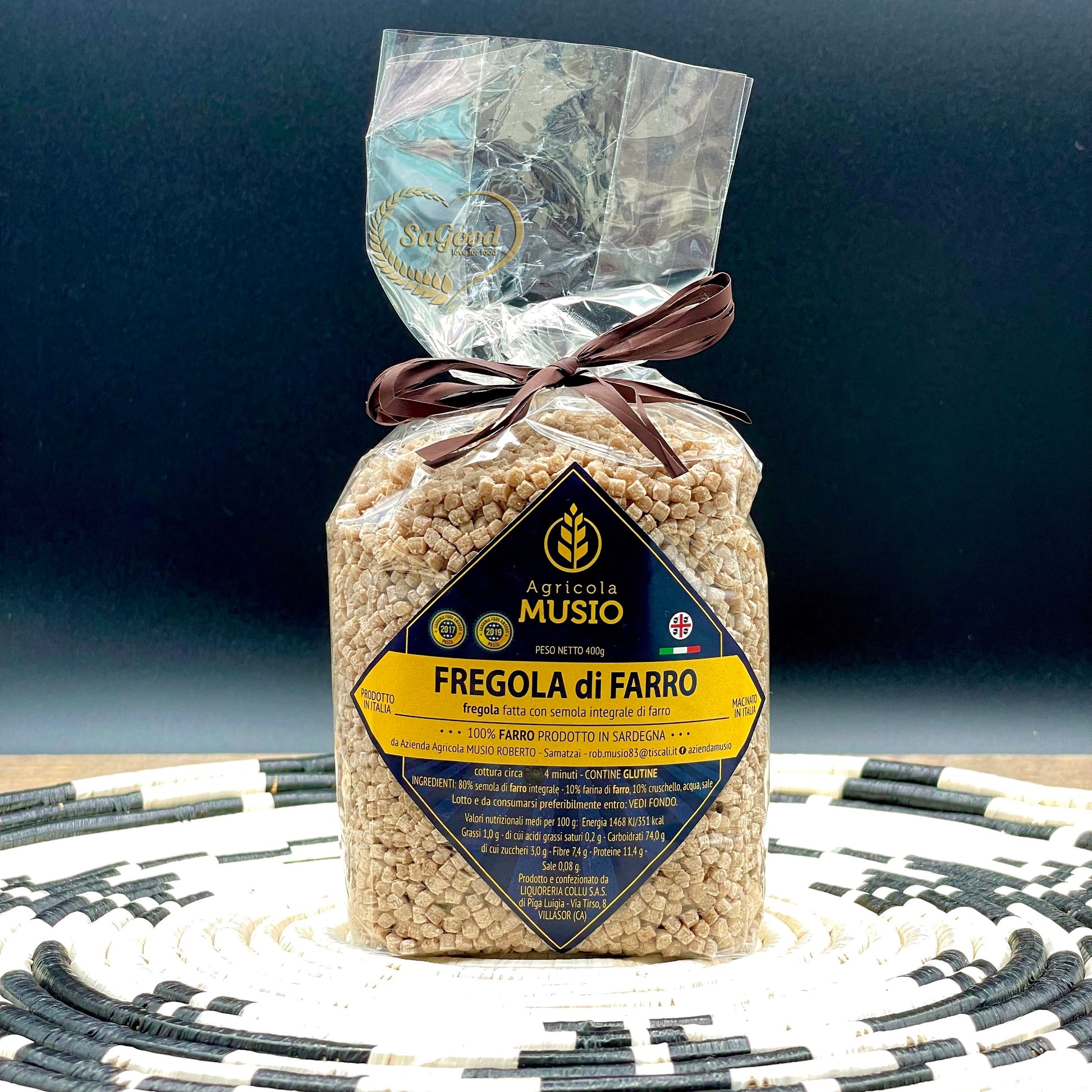 Ingredienti: 70% semola di farro integrale 100% sardo, 30% farina di farro 100% sardo, acqua, sale - senza coloranti e conservanti.