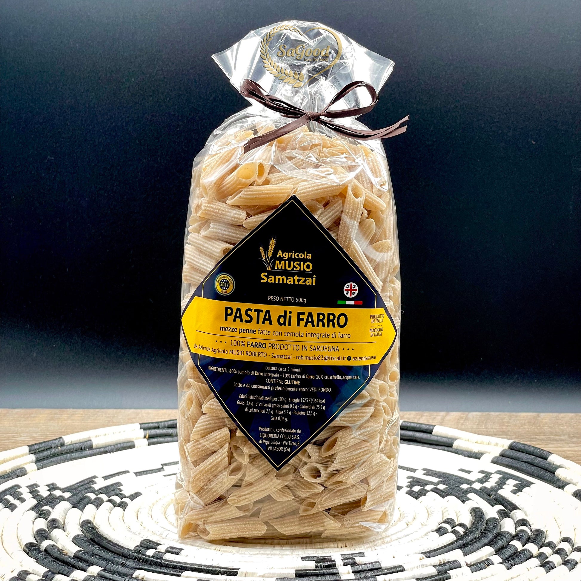 Ingredienti: 70% semola di farro integrale 100% sardo, 30% farina di farro 100% sardo, acqua, sale - senza coloranti e conservanti.