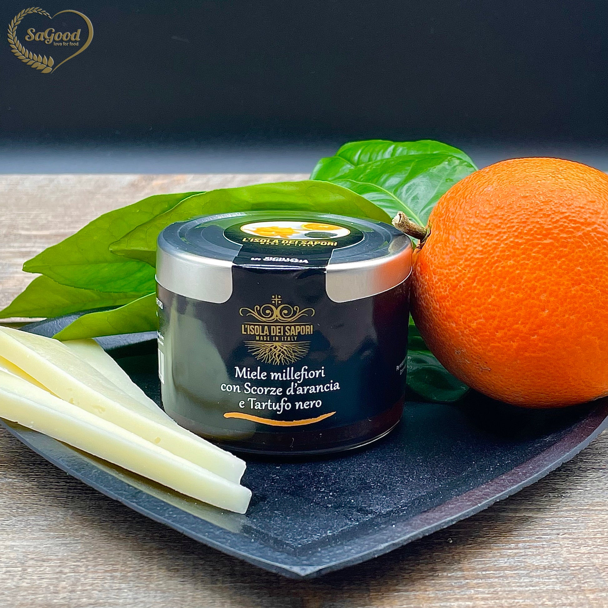 Miele Millefiori, proveniente da apicolture locali, con scorza d'arancia e Tartufo Nero. Dal gusto dolce e intenso, è ideale su formaggi freschi o semistagionati, fondute, seadas e dolci di ogni genere.