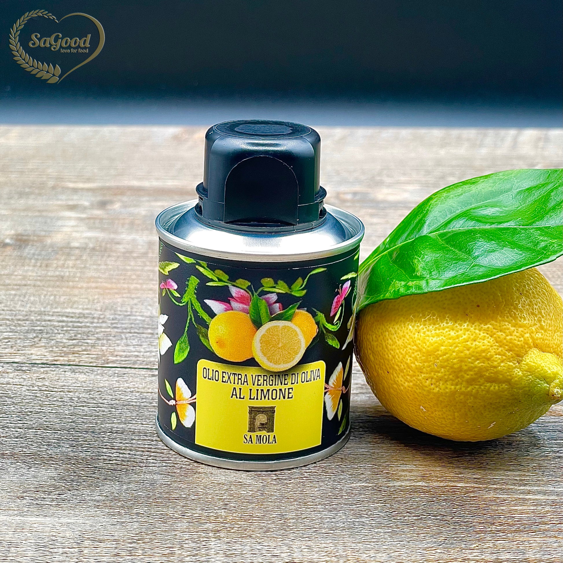 Olio Extra Vergine di Oliva aromatizzato al Limone, ottenuto con frangitura tradizionale e metodo di estrazione a freddo, dal gusto aspro e profumato.