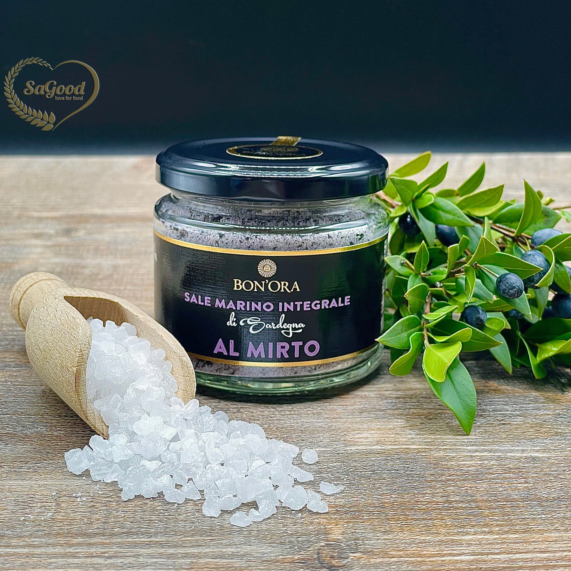 Sale marino integrale della Salina di Sant'Antioco aromatizzato al mirto, naturalmente ricco di oligominerali marini, ottenuto dalla naturale evaporazione dell'acqua di mare, senza alcun trattamento chimico, ideale per insaporire secondi di carne e zuppe di legumi.